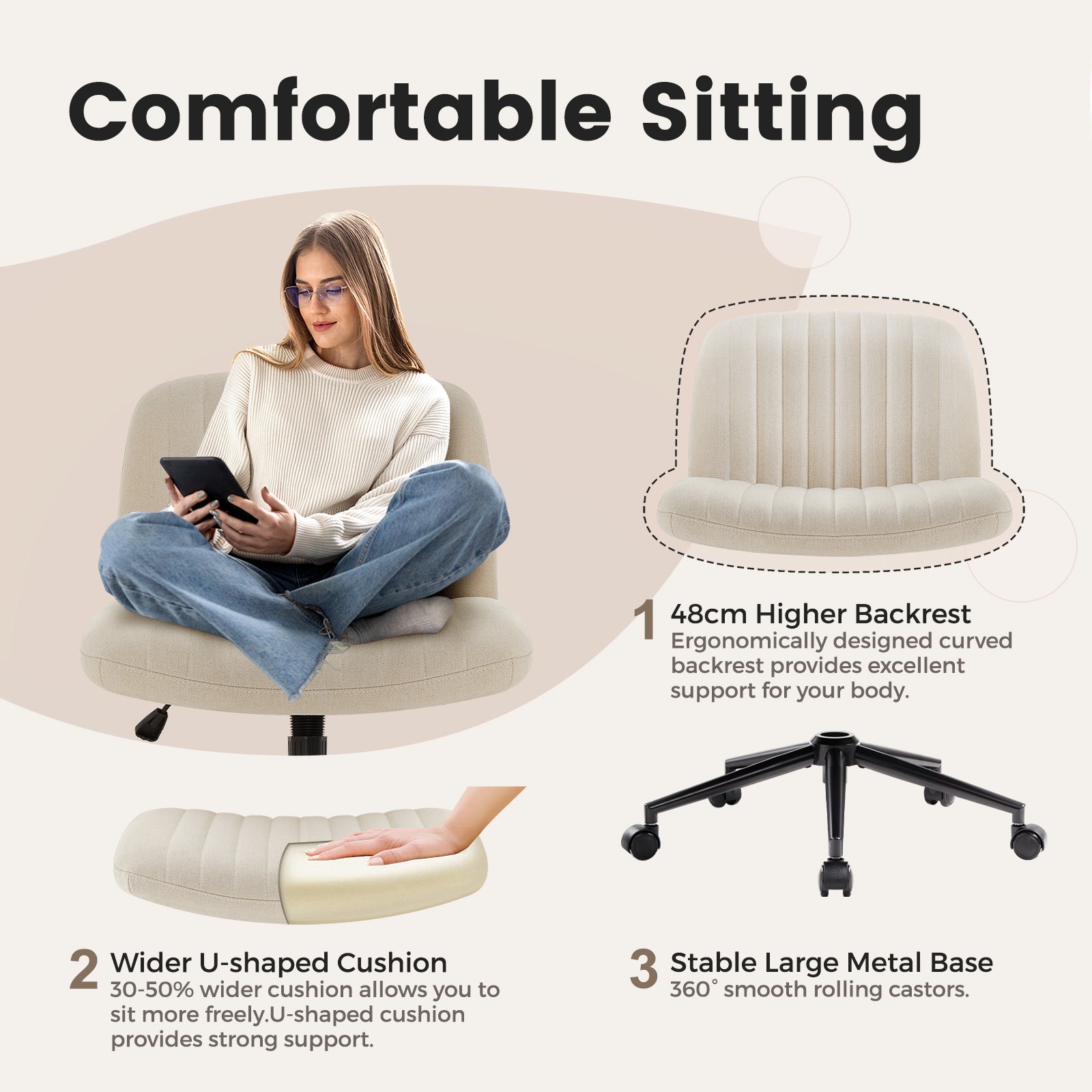 - 【Soft and Wide Seat】 The widened seat and heightened backrest allow you to comfortably cross your legs on the chair. It is filled with high-density sponge with a density ≥30KG/M³, providing excellent resilience. The seat cushion is covered with comfortable fabric, soft, skin-friendly and breathable. The super stable pentagram base under the spacious cushion will provide you with comfort all day long.